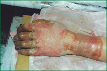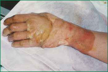 深Ⅱ度深型燒燙傷創(chuàng)面的處理: 早期按淺Ⅱ度燒燙傷創(chuàng)面的處理方法治療,5天后去掉腐皮。因真皮組織已受損,創(chuàng)面呈蠟白色,應(yīng)繼續(xù)涂藥,厚度薄于1毫米,每4小時(shí)更換一次藥膏。用藥后,可見創(chuàng)面因藥物作用而出現(xiàn)的壞死組織液化物排出,此表現(xiàn)為正常(不要誤以為是感染)。但應(yīng)注意,每次換藥前,須將創(chuàng)面上殘留的藥物及白色液化物用消毒紗布或紙巾輕輕拭去后再涂藥,大約15天后,壞死組織被液化排除,創(chuàng)面出現(xiàn)纖維隔離膜,然后繼續(xù)按上述方法治療保護(hù)纖維隔離膜,直至創(chuàng)面平皮愈合。如果治療時(shí)間超過三周,創(chuàng)面仍未愈合,表明為淺Ⅲ度創(chuàng)面,應(yīng)繼續(xù)按Ⅲ度創(chuàng)面的治療方法治療。