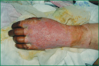 2、 傷后5天去除腐皮,創(chuàng)面壞死皮膚組織液化排除。
