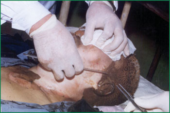 5、 傷后第18天,壞死皮膚液化排除,用紗布無損傷地吸附液化物。注意保護(hù)創(chuàng)面纖維隔離膜。