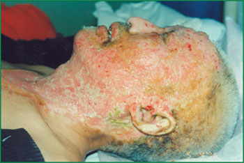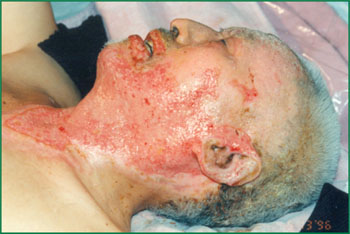 1、 面部淺Ⅲ度火焰燒傷,無疼痛,無滲出。
