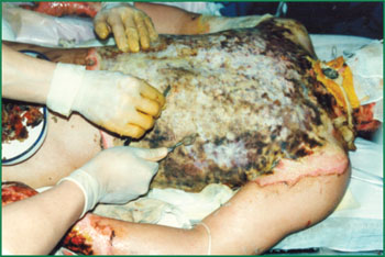 2、 對胸部Ⅲ度燒傷創(chuàng)面進(jìn)行耕耘減張術(shù),敷用MEBO,采取燒傷濕潤暴露療法(MEBT)治療。