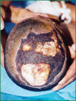2、傷后2天清創(chuàng),按骨燒傷的治療方法,對(duì)顱骨鉆孔(穿透外板)外敷MEBO治療。