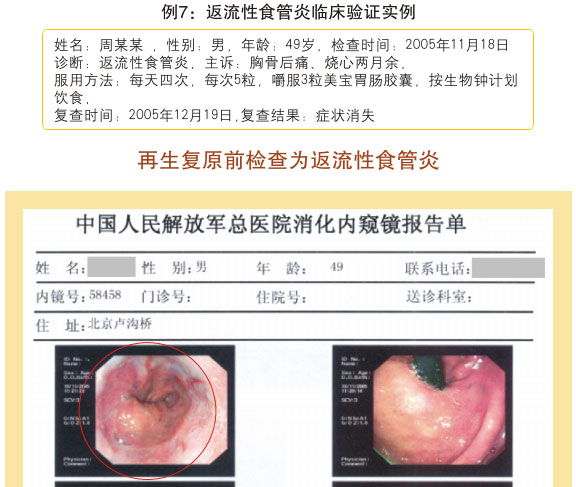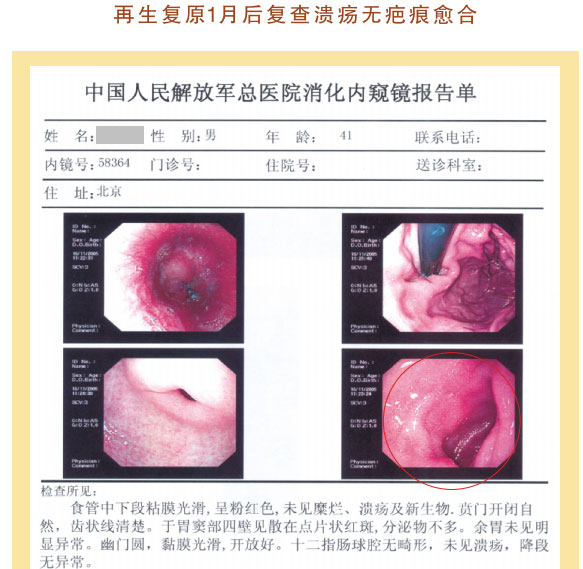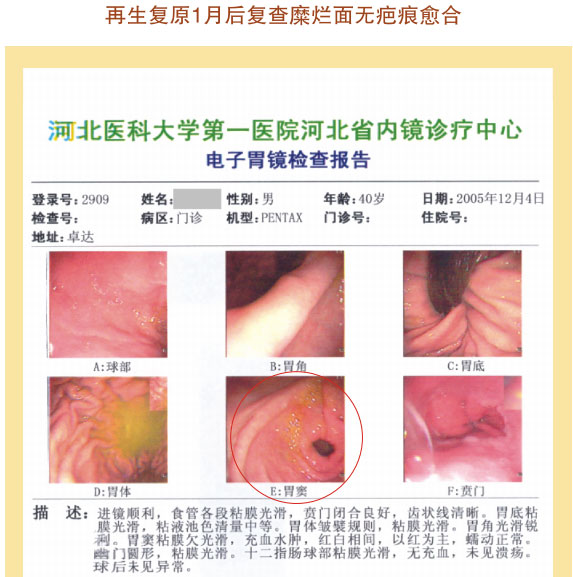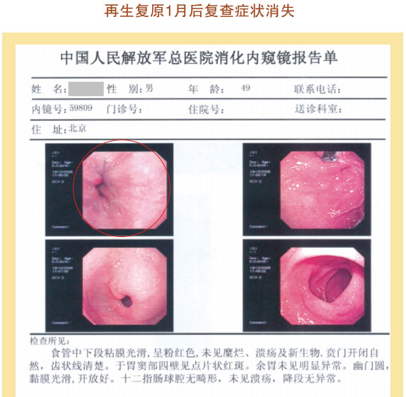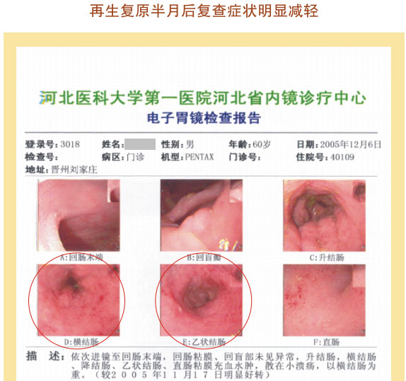 例1:張某某,男,56歲, 2007年5月開始胃腸再生復(fù)原,半年后整個(gè)胃腸系統(tǒng)大部分再生復(fù)原,粘膜體征均表現(xiàn)為年輕狀態(tài)。
