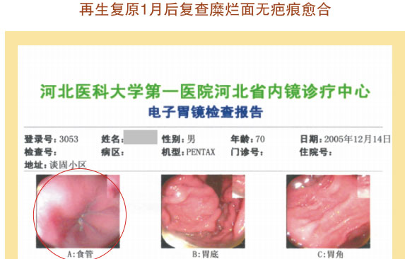 例2:蓋某某,女,54歲,2007年6月開始胃腸器官原位再生復(fù)原,一年后整個(gè)胃腸系統(tǒng)大部分再生復(fù)原,粘膜體征均表現(xiàn)為年輕狀態(tài)。