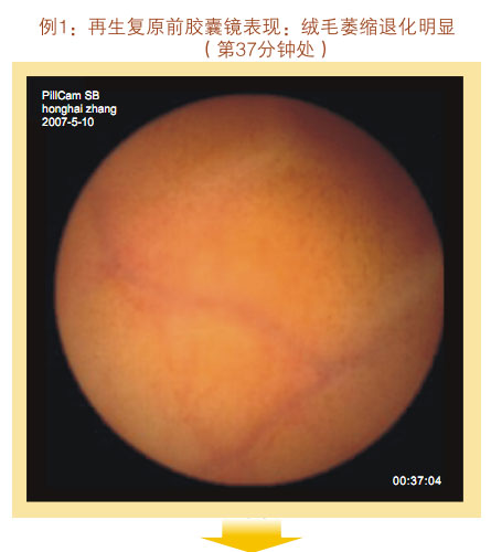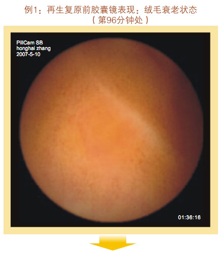 再生復(fù)原前膠囊鏡表現(xiàn):小腸粘膜和粘膜下層明顯萎縮退化,變薄,粘膜下血管網(wǎng)及血管畔清晰可見,小腸絨毛稀疏、長度變短、退化明顯,部分區(qū)域絨毛完全脫失,隱窩變淺,整個(gè)絨毛面積變小。整個(gè)胃腸黏膜系統(tǒng)呈現(xiàn)衰老狀態(tài)。