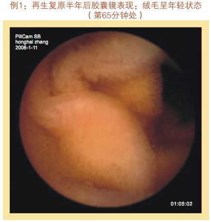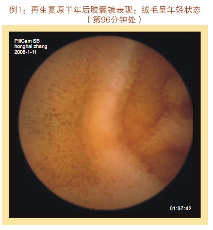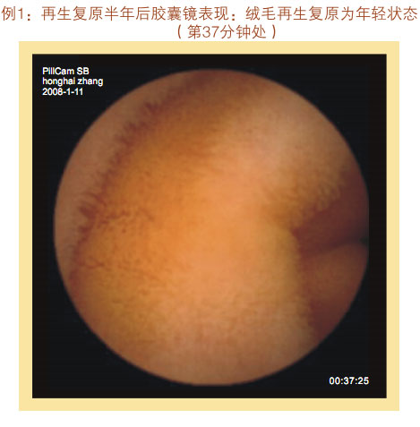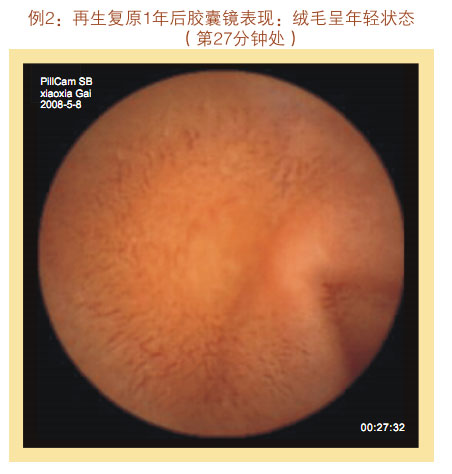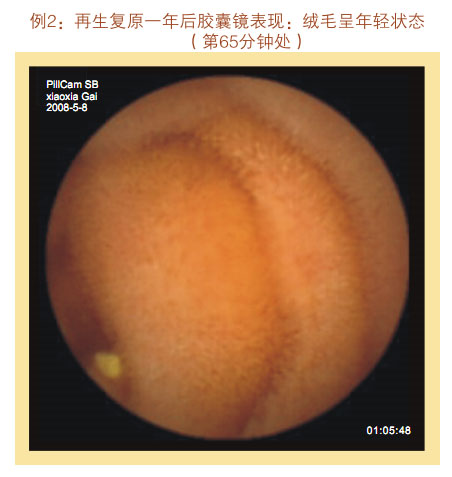 再生復(fù)原半年后膠囊鏡表現(xiàn):小腸粘膜和粘膜下層明顯增厚,看不到粘膜下血管網(wǎng)及血管畔,絨毛濃密、發(fā)達(dá),豐滿,長度增加,直徑增粗,沒有明顯斷裂、脫失的絨毛粘膜,隱窩變深,整個(gè)絨毛面積明顯擴(kuò)大。整個(gè)胃腸黏膜系統(tǒng)呈現(xiàn)為年輕健康的狀態(tài)。