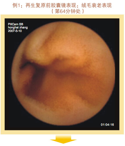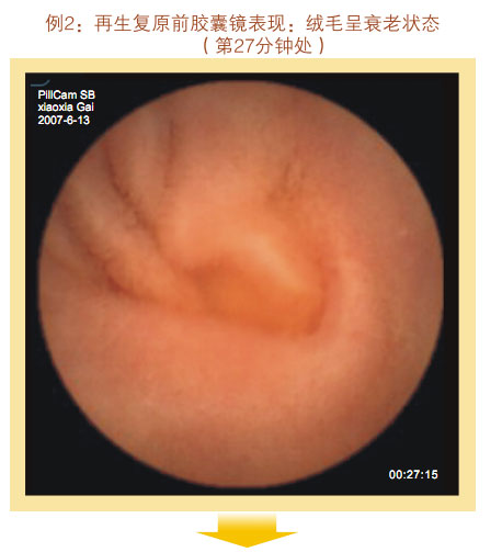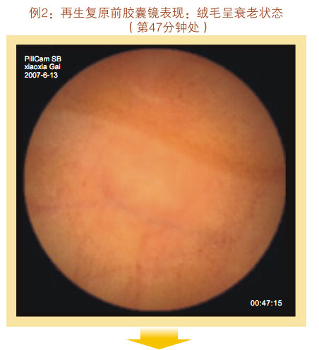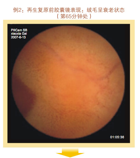 再生復(fù)原前膠囊鏡表現(xiàn):小腸粘膜和粘膜下層明顯萎縮,變薄,粘膜下血管網(wǎng)及血管畔清晰可見,絨毛稀疏、增寬而短、斷裂、退化、部分區(qū)域絨毛脫落甚至脫失,隱窩深度變淺。整個(gè)胃腸黏膜系統(tǒng)呈現(xiàn)衰老狀態(tài)。