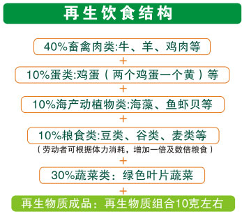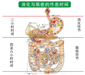 接下來講作息時間,簡單講,人在飯后食物的下行時間。人的胃開始排空時間是2小時,所以6點吃飯,要8點胃排空后再睡覺,才會感覺舒服,要把胃排空的時間留出來,這些食物在小腸中再停留4—6小時,在這個過程中吸收營養(yǎng)。這就是人為什么要一日三餐的原因,也正是為了人體不間斷的吸收營養(yǎng)。這樣胃腸道在一天中都沒有停下來,早飯后胃腸開始消化吸收,等消化完后就又開始吃午飯了,午飯消化吸收后又得吃晚飯,所以胃腸道一天都得工作,不能休息。因此我就提出人胃腸道的作息時間應(yīng)該是,白天時要少吃,讓胃腸略微休息休息,而且還能少牽涉人的精力。晚上睡覺時其他器官消耗能量少了,這時就可以多吃點兒,讓胃腸道多干干活,吸收好營養(yǎng)。這就是我們提出的早吃好、午吃少、晚吃飽的生物鐘飲食。吃什么大家都知道了,這個很簡單,但是從機理上講,吃的東西和細胞最后得到的營養(yǎng)的關(guān)系是比較復(fù)雜的。如吃了牛肉后,牛肉進入胃后,牛肉中的少量蛋白質(zhì)就轉(zhuǎn)化成了氨基酸,但大多是都是在腸道轉(zhuǎn)化的;牛肉中的脂肪在胃中并沒有轉(zhuǎn)化,淀粉在胃內(nèi)也不消化,只不過是胃酸和胃的研磨,把粗的淀粉變細了,基本上各種食物在胃內(nèi)都能有一定的轉(zhuǎn)化。很多人認為飯后人就會有勁兒,實際上并不是這樣的,剛剛飯后是最沒勁兒的時候,許多的心臟病等疾病都是在飯后發(fā)作的,這都是吃飯累的,人在吃飽飯后就會像爬山一樣累了。一旦食入食物,胃就會啟動,胃會根據(jù)攝入食物的不同會產(chǎn)生大量不同的消化液,比如人在喝了糖水之后,就會感覺胃酸,糖引起了大量胃酸的分泌。吃幾份不同的食物胃腸道也就會產(chǎn)生相應(yīng)的幾份消化液。因此建議大家在吃飯時一定要多樣化,食物過于單一,胃腸道就會失去相應(yīng)的功能。按照我們今天所講的再生養(yǎng)生標準吃就會達到多樣化飲食,蛋白質(zhì)、脂肪、維生素、礦物質(zhì)等全部都有了,消化液的分泌就會均衡。有些人減肥時光吃水果,結(jié)果肥是減了,但卻檢查出了癌癥,這就是因為其營養(yǎng)不均衡,細胞得不到充足的營養(yǎng),餓出了癌。