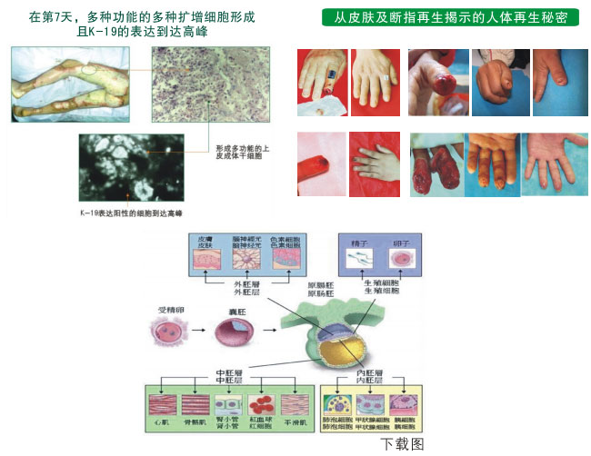 我們從皮膚和斷指再生復原結果來揭示人體再生。斷指能再生嗎?世界上認為斷指是不可能再生的。新生兒指尖少了一點可以再長,這是因為其還未發(fā)育完全,但成年人就不可能再生了。不久前,美國《科學》雜志組織了很多科學家設想了將來要解決的問題,其中就有斷指再生??墒俏覀円呀洶阉兂闪爽F實,我們也不是先發(fā)現了再生后才有了斷指再生,也不是由燒傷的皮膚再生想到了指頭再生,而是在試驗中才發(fā)現了這個斷指再生的現象。我在以往的實驗中發(fā)現環(huán)境決定了器官的修復程度,但起初并沒有聯想到再生,后來才在細胞試驗中發(fā)現愈合傷口的細胞有差異,我就開始認為這是再生細胞造成的,經過做實驗,最后發(fā)現了斷指也可以再生。我們的這個斷指再生是再生復原,恢復得和受傷前一模一樣,而不是他們說的普通愈合。我從這個聯想到人的肢體,這個手指頭和人的腿,胳膊是一樣的,都有血管、神經、骨頭、肌肉、皮下組織等各個組織與器官。不要看這些部位它們大小相差很大,但組成指頭和腿的四大組織神經組織、肌肉組織、結締組織、上皮組織是一樣的,而指頭的組成組織比腿還要多。人雖然至少有60萬億個細胞組成,但可以都劃分到這四大類之中。所以我就從這指頭的再生聯想到人的其他器官和組織的再生,考慮到它們在胚胎時的關系,這個意義就大了。大家知道(如圖示各個胚胎發(fā)育結果)胚胎的三個胚胎層產生的器官不同,按一般的理論,人的器官損壞了要想再生,必須走從胚胎到這些器官的發(fā)育過程,可是我們沒有這么做,就實現了器官再生。這個結果就把傳統(tǒng)的生命科學常識顛覆了,無論那些生命科學家的經驗多好,資料多豐富,在我們這里都用不上了,我們沒有任何經驗和規(guī)律可借鑒,只要按發(fā)現的規(guī)律向前實踐,這也是我們?yōu)槭裁匆⑷梭w再生復原科學的原因。