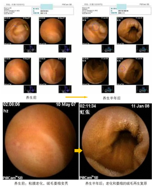 3. 衰老的胃腸粘膜再生復(fù)原:衰老的胃腸粘膜能復(fù)原回較年輕的粘膜,這在醫(yī)學(xué)和保健學(xué)上,從沒有人想到。而在本研究的再生復(fù)原療法上,已經(jīng)實(shí)現(xiàn)了。我們的研究表明,人過40歲,人的胃腸粘膜等開始走向衰老,其衰老程序的啟動(dòng)比任何器官都早,過了50歲,人的胃腸粘膜就有約一半的細(xì)胞不發(fā)揮應(yīng)有的功能,并且衰老和凋亡了,到90歲,有功能的細(xì)胞也只剩下不到10%。我們的研究臨床應(yīng)用結(jié)果表明,只要進(jìn)行半年的胃腸再生復(fù)原養(yǎng)生,衰老的胃腸粘膜就能原位再生復(fù)原,而后繼續(xù)保持再生復(fù)原養(yǎng)生,就能保障胃腸功能維持在正常較年輕的狀態(tài)。(圖14 為腸鏡圖片)