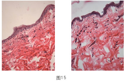 我們做了大白鼠試驗,喂養(yǎng)的兩批老鼠都是300天的成年白鼠,一組吃膳素,10%的;一組對照,同樣的量喂養(yǎng),喂到826天,喂再生物質(zhì)的這組除去兩個拉肚子死亡的,剩下都活著。  而對照的那一組,只有一只活到826天,其他都在550天左右死亡。把所有臟器做組織切片(圖15),試驗組老鼠的皮膚