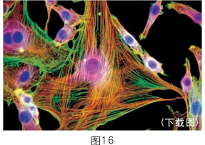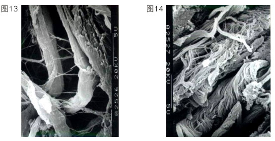 上述內(nèi)容說明再生復(fù)原重要的是要恢復(fù)其皮膚正常的生理功能。正常人的皮膚衰老了,意味著他皮膚的很多功能缺失了或退化了。因此我們的皮膚再生必須控制細胞,讓細胞強壯,恢復(fù)正常生理功能。我們在實踐中就啟動了角蛋白十九型干細胞,當(dāng)然也可以啟動角蛋白十九型以下的細胞。我們首先把表皮基底層細胞啟動起來,使它可以增加生命活力,重建,同時成纖維細胞也更新。一個90歲的老人,基底細胞只有5%是有功能的。人一旦衰老了,細胞就難以再生到足夠的數(shù)量,所以一定要保證再生物質(zhì)的量,確保細胞的功能。一般來說,成纖維細胞的功能,隨著年齡的增長會代謝低下,這個低下指的是產(chǎn)生纖維的速度減慢、產(chǎn)生的量減少,產(chǎn)生的膠原纖維不成束。一個正常細胞產(chǎn)生的纖維如左圖所示(圖13),一個衰老的細胞產(chǎn)生的纖維如右圖所示。(圖14)這個衰老的細胞產(chǎn)生的絲是雜亂無章的,沒有彈力,又散又少。人老了,在細胞里產(chǎn)生的原纖維