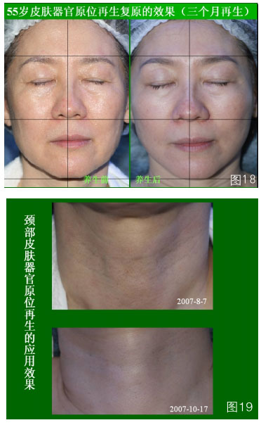 這個皮膚再生復(fù)原是兩個月多,不到三個月,大家看這個臉型,原來的皮膚是原來的美容效果,照片都是皮膚表面清洗干凈以后拍攝的,可以看到,表面不光滑,看上去面部表面由于涂抹化妝品很亮,實際是凹凸不平的,前面已經(jīng)介紹過,已經(jīng)清理到顆粒層了,把角化層都清理了,必須在皮膚表面涂抹化妝品。而后面的照片呢,就是整個皮膚厚,是表皮的厚度完成了,由棘層、顆粒層和角化層構(gòu)成。而角化層起到看不見的屏障作用,這是從表面來看。從真皮來看,那是厚薄的差異,從我們這個圖片上來看,隨著年齡增長皮膚會塌陷,有兩種塌陷:一個是皮下組織塌陷,是肌肉和脂肪組織萎縮;一個是皮膚塌陷,皮膚塌陷是下墜,皮膚一下墜就撐不起來,后面這張照片是再生不到三個月的,可以看出皮膚撐起來了,最難得的就是皮膚撐起來的豐滿,要持續(xù)保持這樣豐滿那就解決問題了。如果一個三十幾歲的人,皮膚還沒有下墜,那進行再生就可以保持了,就像我們已經(jīng)成功了的大白鼠試驗一樣,可以保持了。那些皮膚已經(jīng)衰老的我們可以讓皮膚恢復(fù)。從頸部來說,原來的照片塌陷得很明顯(圖19),我們可以讓皮膚變得豐滿,但必須始終保證每一次都將再生物質(zhì)導(dǎo)入進去,導(dǎo)入不到皮膚內(nèi)細胞就沒有再生營養(yǎng)了,一旦停止器官再生皮膚就不再保持再生的最佳狀態(tài)了,但不會回到再生前的狀況。頸部皮膚非常松弛,與面部皮膚組織不同,面部以膠原纖維為主,頸部彈力纖維增多了,同樣導(dǎo)入再生物質(zhì),在面部可產(chǎn)生大量膠原蛋白,在頸部產(chǎn)生較少,因為頸部彈力纖維多,這就是為什么現(xiàn)在頸部效果會差一點,我們將來導(dǎo)入再生物質(zhì)的量,頸部要超過面部2—3倍,才能起到更好的導(dǎo)入作用。