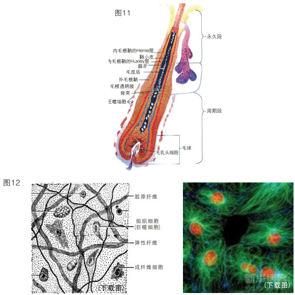 汗腺分泌細胞。毛囊細胞是從卵胚開始的一個新的細胞,是一個獨立的家族。人的身上有三種毛:短毛、長毛和毳毛,頭發(fā)為長毛。從胚胎時期開始,生長毛發(fā)的細胞就有三個不同原發(fā)細胞,一個是長長毛的,一個是長短毛的,一個是長毳毛的,毳毛即汗毛。它們發(fā)生的時間不同,短毛和長毛是來自于最原始的卵胚,而汗毛可來自于表皮干細胞,也就是角蛋白19型家族。所以大面積深度燒傷時愈合以后都能長汗毛,但長不了長毛也長不了短毛。在這里也告訴大家,對付脫發(fā)應(yīng)該在人還沒有脫落頭發(fā)前加以控制,不讓頭發(fā)脫落,一旦毛乳頭全脫落了就長不出頭發(fā)來了,能長出的不過是類似于短毛的一些毳毛(圖11)。這是因為在再生時,毛發(fā)是利用毛發(fā)里邊儲存的信息機關(guān)——隱窩來再生的,毛隱窩里儲存有短毛和毛干的信息,任何皮膚里面都有這種信息。由于人的進化造成有些部位不長毛,有些長毛,這個毛隱窩是由于人的進化所形成的,但種族不同,毛隱窩則有所不同,就像美國人身上有很多毛,但那也是短毛而不是長毛。咱們亞洲人皮膚比較平滑,棕色人、黑人也比較平滑,是因為隱窩比較弱,不長那么長的毛。我們曾研究過怎么能讓光禿頭頂長出細毛,當(dāng)初我們把每個細胞都拿出來,看是哪一種細胞長的,發(fā)現(xiàn)都是毛隱窩長的。雖然一旦失去了毛囊就不能再長頭發(fā)了,但是只要毛隱窩還在,就還有長毛的功能,每一個隱窩都能長出一個毳毛來。社會上某些生發(fā)產(chǎn)品就是刺激這個隱窩的細胞,但這種刺激所長出的毛很脆弱,一碰就掉了,一旦沒有刺激作用了,這毛發(fā)就不長了。我們在燒傷治療中也發(fā)現(xiàn),只要有皮膚產(chǎn)生就有毳毛,當(dāng)然手掌除外,手掌是沒有毳毛的,這是遺傳的特性。有人問男性的胡須是什么毛?這個毛有短毛的種類,也有長毛的種類,主要是長毛種類。