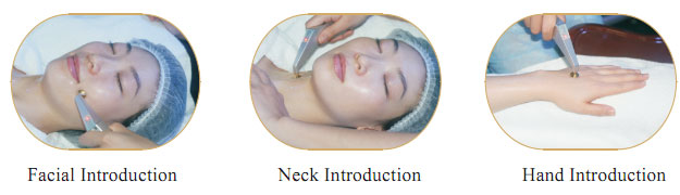 Approach I: This procedure can be performed in beauty parlor or even at home by the direct introduction of liquid regenerative nutrients to dermis and epidermis with 2P hyperbaric machine, once a week or once every other week.  However, daily skin-care kit of regenerative nutrient emulsion is required after introduction to ensure the continuous supplement of regenerative nutrients for skin regeneration, at least once in both morning and night.  Illustration of application procedure: