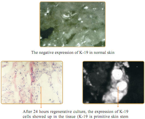 After the absorption of regenerative nutrients, the stem cells in lamina basal layer and dermis tissues can be recovered and regenerated with normal structure and function, which helps to maintain the vigor of epithelial tissues in epidermis and hypodermis and all other organs in the skin, and to prevent and eliminate the pigmentation and other symptoms caused by skin aging. (Research pictures of K-19 cells enclosed).