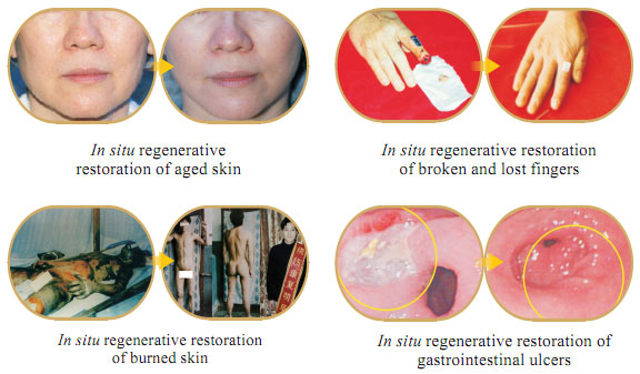 During the research of regeneration in burned skin, we have fulfilled the regeneration of skin and all of its appendages on the wound surface and discovered the secret of in situ regeneration of skin and appendages.  After further research, we fulfilled the in situ regeneration of all human organs, declared the secondary life cells of human body: Potential Regenerative Cells (PRCs) and fulfilled the in situ regeneration of full thickness skin, severed fingers, gastrointestinal organs and other organs.  All these marvelous inventions have obtained the international copyrights and patents in US, Europe, Japan and China.  We are the only one in the field who really clinically fulfilled the organ cloning from somatic cells, in situ organ and human body regeneration worldwide.