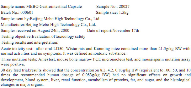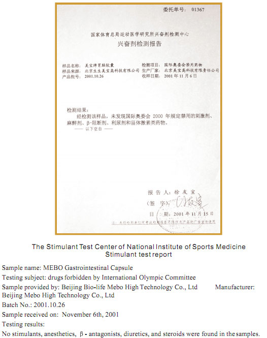 According to the test performed by Stimulant Detect Center of Olympics Committee, MEBO Gastrointestinal Capsule does not contain any hormone forbidden to be administered.