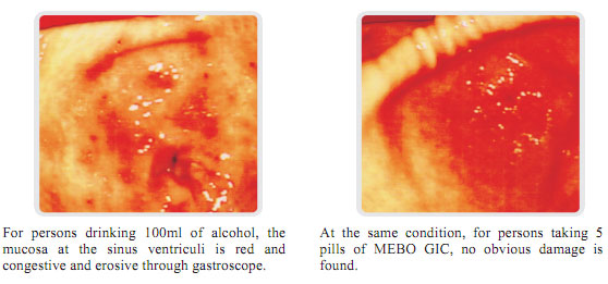 First: MEBO helps to prevent the damage of alcohol to gastrointestine. The contents of MEBO GIC will stick to the surface of mucosa directly after