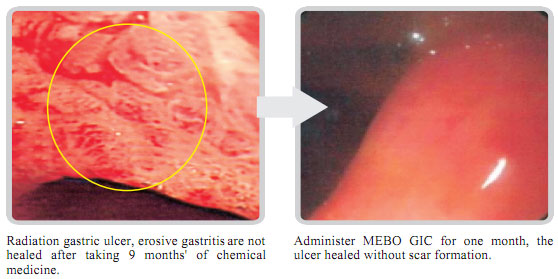 One of the main side effects of radiation is the gastrointestinal tract damage which can be accumulated, which will cause gastrointestinal long-term damage or even necrosis, various gastrointestinal tract disorder or even erosion and ulcer. MEBO gastrointestinal regenerative restoration technique can regenerate new mucosa on the radiation ulcer site.