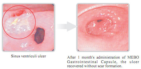 Gastrointestinal ulcer is a disease hard to be treated but recurs easily. The main reason is: the ulcer will heal with scar formation for either natural healing or treatment by drugs. The mechanism of all the treatment is aimed at the early scar formation of the ulcer wound in order to alleviate the pain and danger of the patients. However, the healed site with scar does not have the function of mucosa and does not have self protection function. The healed site will be damaged again at any time by the food or other factors in the gastrointestinal and consequently erosion and ulcer will recur. MEBO gastrointestinal mucosa regenerative restoration technique proves: utilizing the residual living tissue cells and stem cells existing in the gastrointestinal ulcer to regenerate new gastrointestinal mucosa. The most important factor for mucosa recovery without scar formation is isolating the ulcer wound from the damage of gastrointestinal contents such as food and medicine and establishing ecological environment for mucosa regeneration. This isolating function and environment can be supplied by MEBO Gastrointestinal Capsule. Meanwhile, it can promote and nourish cell to regenerate new mucosa to repair the ulcer wound and recover function. The clinical experiment proves: when treating gastrointestinal ulcer with MEBO Gastrointestinal Capsule, the gastrointestinal ulcer wound can heal without scar formation, so MEBO Gastrointestinal Capsule is the perfect companion of the medicine treating gastrointestinal ulcer. The method is: the medicine treatment can be continued, 5 MEBO Gastrointestinal Capsules are administered every 6 hours. If the symptom is not relieved after 30 minutes, 5 capsules are added until the symptom disappears. Generally the prescription time is one month. However, for severe and large area of ulcer wound, the capsules can be administered until the complete healing of wound without time limit.