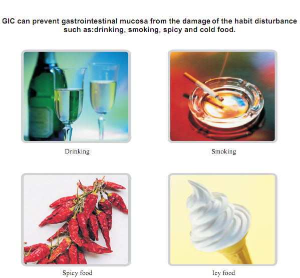 GIC can prevent gastrointestinal mucosa from the damage of the habit disturbance such as: drinking, smoking, spicy and cold food.