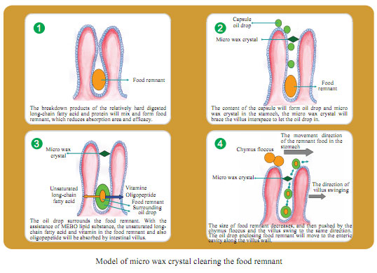  Increase nutrition absorption area: MEBO Gastrointestinal Capsule will form tiny crystal body after entering the intestinal tract. This crystal body will adhere at the positions among the intestinal villi and they will clear the accumulated food remnant automatically with the peristalsis of intestinal tract.  Then the absorption surface of the villus is enlarged, which will promote the ability and efficiency of nutrition absorption.