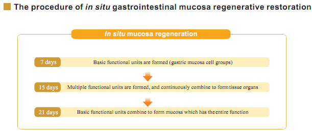 The MEBO regenerative restoration technique can supply necessary nutrition for the gastrointestinal mucosa stem cells and also the in situ tissue cells, consequently the potential regenerative cells and stem cells will be initiated for proliferation and differentiation at the injured site to achieve the regeneration & restoration of the injured or ulcerative mucosa without scar formation.  The original physiological function and structure can be recovered through this process.