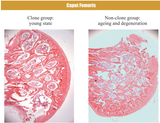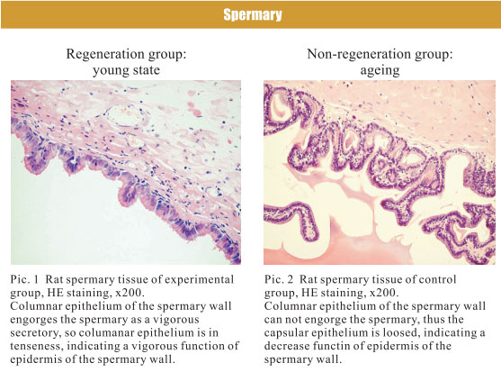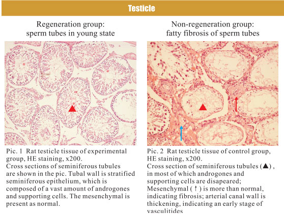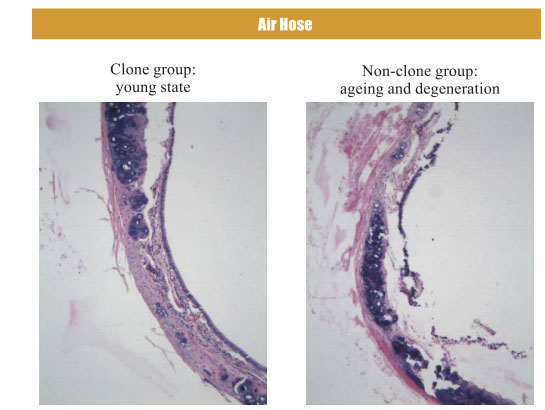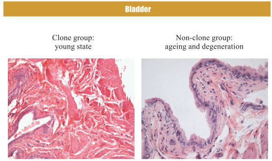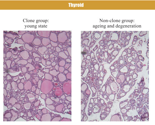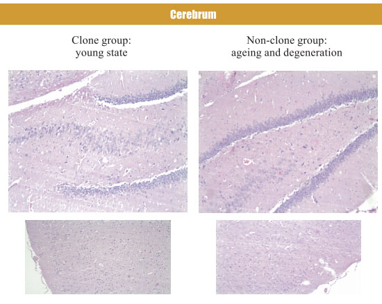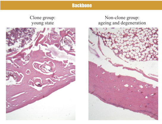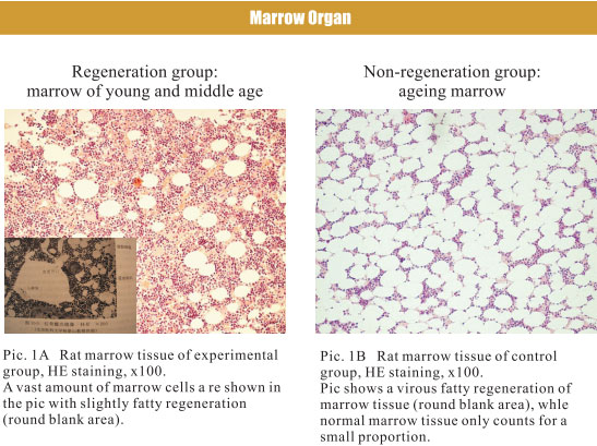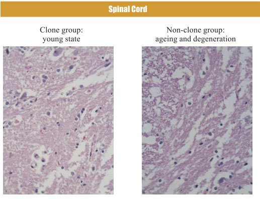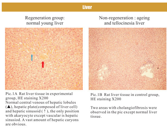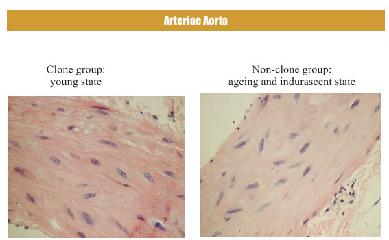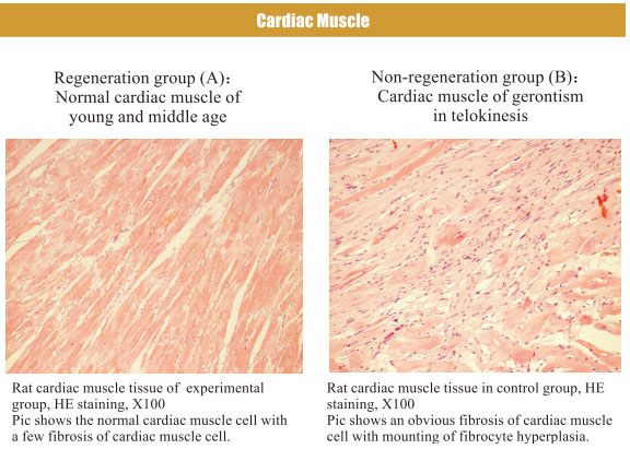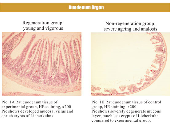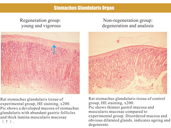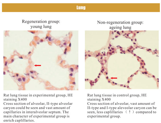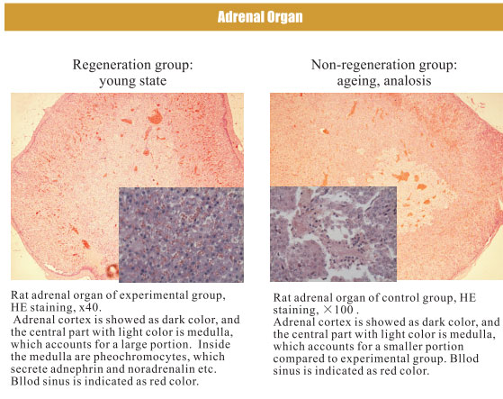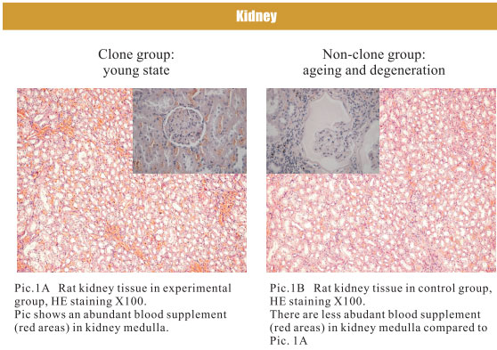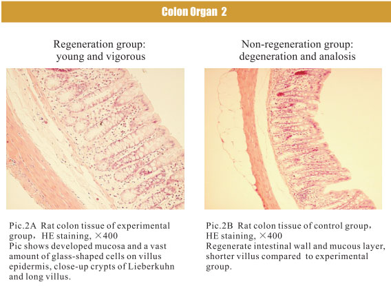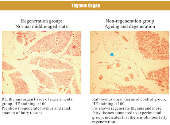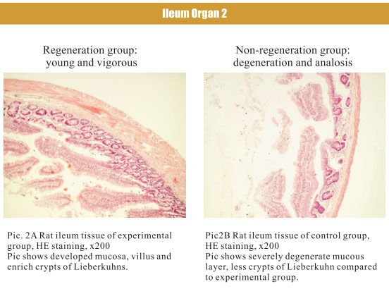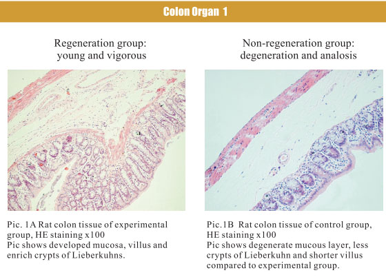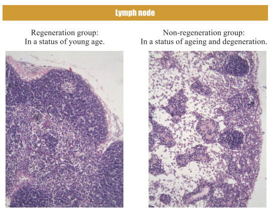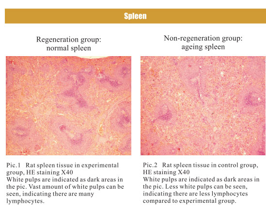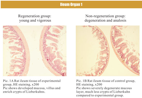 Nearly all rats in control group died between day 500 and day 600, and only one survived after day 600.  Rats in test group were still alive on day 826, and there were still enough rats alive for obtaining standard statistic data.  To end the experiment, the rats in test group were killed and the histological changes of two groups were compared.  Results indicated that the organs of rats in test group were in younger state, and the organs of rats in control group were in ageing and degenerating state.and organs of rats in control group showed a status of agering and degenerating.