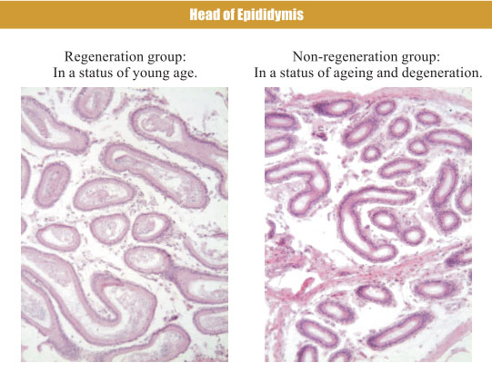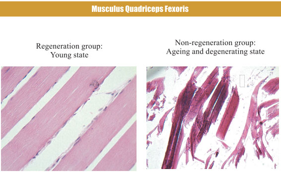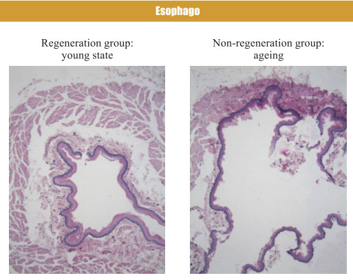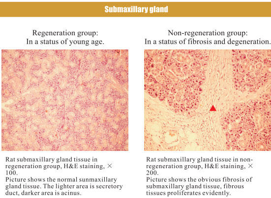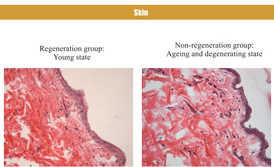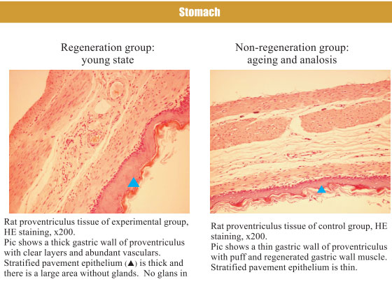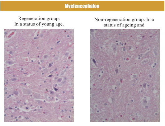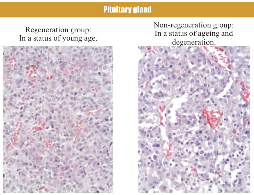 Laboratory rats were reared in a standard environment growing to 300 days old (beginning of the aging), then were divided into two groups, one was test group (regenerative nutritional group) fed with standard nutritional food mixed with regenerative substances; the other was control group (non-regenerative nutritional group) fed with the same standard nutritional food, plus the same amount of water instead of regenerative substances. Continue to rear them in standard environment.