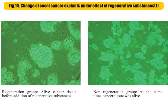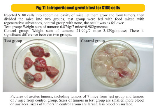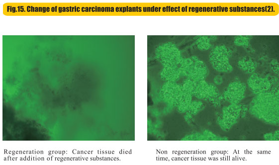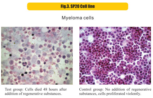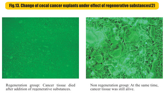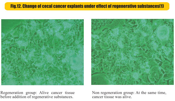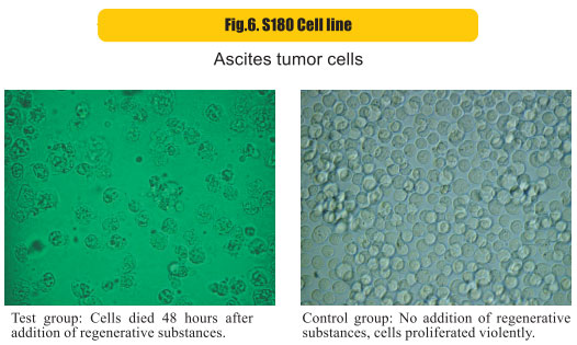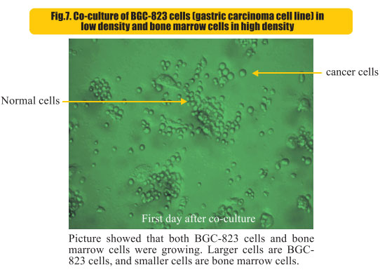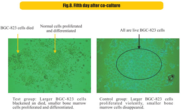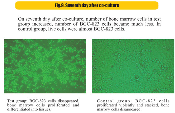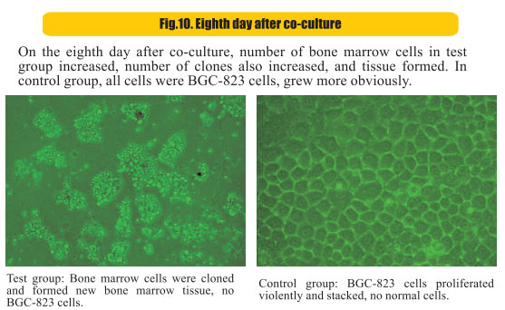 Co-cultured mouse bone marrow progenitor cells and gastric cancer cell line BGC-823, added a certain amount of regenerative substances, cancer cells died and disappeared within 5 days, but mouse bone marrow progenitor cells proliferated and formed tissue colonise of bone marrow.  In control group containing no regenerative substances, bone marrow progenitor cells died and disappeared, and at the same time gastric cancer cell lines proliferated vigorously.  (See Fig.7-10)