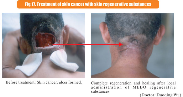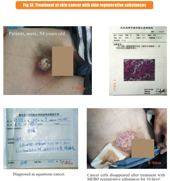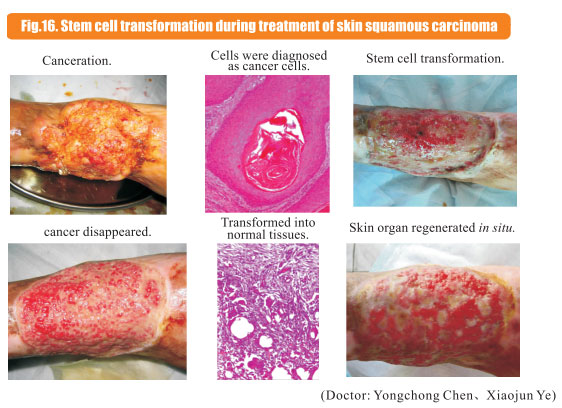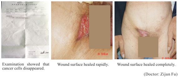 Squamous cell carcinoma patients:  Clear the necrotic tissue from the surface of the cancer tissue, expose fresh and live cancer tissue, then smear regenerative substances, and change the regenerative substances twice daily; 21 days later, cancer cells in the skin carcinoma wound disappeared, and then the skin healed. (See fig.16)