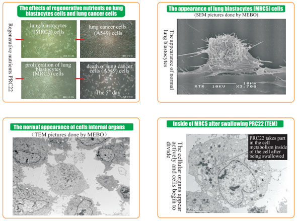 The result was as follows: after the normal cells swallowed the regenerative substances, metabolism of the cell organelles was stimulated, nuclei divided actively, regenerative substances were exhausted by metabolism; however, no obvious proliferation occurred to normal control lung cells without presentation of regenerative substances.  After lung cancer cells swallowed the regenerative substances, metabolism of organelles of cells stopped on the instant; on the first day, pseudopodia of cells broke, mitochondrion swelled and died, chromocenters contracted, metabolism and exhaustion did not happened to the phagocytized regenerative substances, and cells died in apoptosis on the second day with no changes for phagocytized regenerative substances.