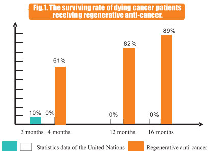 We have deciphered the growth law of cancer cells on cellular levels, and also construed the law of cell organelle change as one of the events that regenerative substances leads cancer cells to apoptosis.  In January, 2008, we declared that we had overcome cancers.  According to the previous cancer cell research data, we began to carry on the research on nutritional caring for the dying cancer patients, in this program, we use 'total nutrient dietotherapy' to help the patients to relieve pain and prolong life span, the statistic data indicated that the surviving rate was 61% in the starting 4 months, 82% in 12 months, and 89% in 16 months. These basic research has showed the possibility of overcoming cancers in the near future. (See Fig.1)