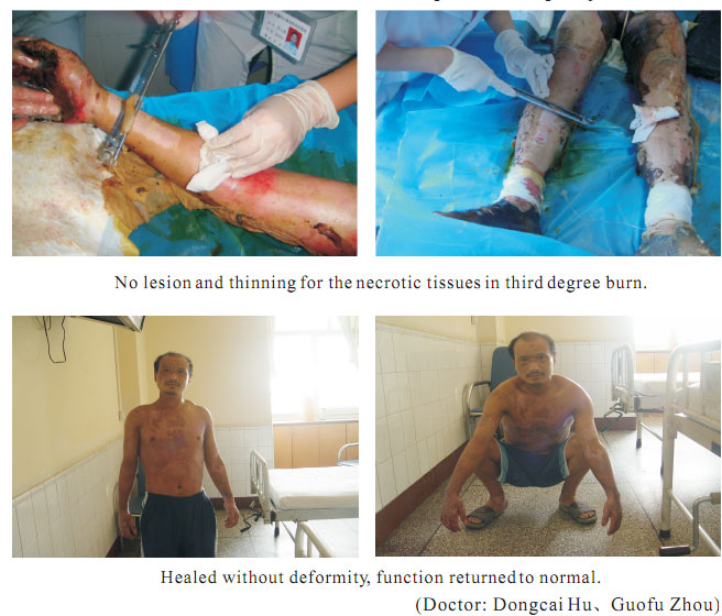 This clinical technique has become the routine protocol for regenerative treatment in China, following is an example: the left side of head was scorched by electrical oven and seriously injured, soft tissues charred, larger part of the facial and cranial bones necrotized.  At the beginning, doctors gave him surgical treatment and drilled the facial and cranial bones.  When no new tissue grew out of the deep holes after treatment for a while, they had to change to our regenerative treatment; after one week of regenerative treatment, granulation regenerated from the holes, necrotized bone was restored, periosteum was regenerated in situ, and it became suitable again for skin flap grafting, the patient finally was rescued.  See the following pictures.