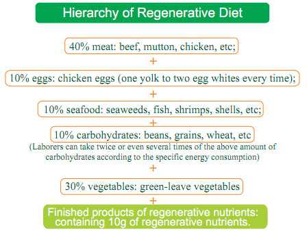 According to the proportion of nutrients essential for human cell growth, which is concluded from the cell culture, we have formulated the food combination of diets and name it as 4:1:1:1:3. This means that the meal should contain 40% of meet, 10% of eggs, 10% of seafood, 10% of carbohydrates, and 30% of vegetables. Details are as following: