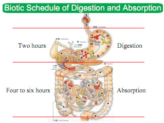 In the following part, I will give an illustration of our working and resting timetable, and the time of food going down after meal.  Two hours are needed to empty the human stomach, so after having dinner at 6 o’clock, the time for emptying the stomach should be reserved, so people should go to sleep after 8 o’clock so as to have a comfortable feeling when the stomach is emptied.  Then the food will stay in the small intestine for 4-6 hours to be digested and absorbed.  This is why people have to take three meals every day to maintain the adequate nutrients for the body.  The GI tract is restless all day due to the digestion and absorption of breakfast, lunch and dinner.  Therefore, I proposed the conception of the work and rest timetable of GI tract, which suggests less eating during the day to make the gastrointestinal less burdened and less energy consumed and heavy eating before sleeping when the other organs consume less energy, and the GI tract can digest food and absorb the nutrition well.  The bioclock diet we have proposed is high quality eating in the morning, less eating at noon, and heavy eating (protein) in the evening.