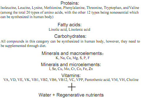 The principle of diet should be to maintain the nutrients for the first life cells while supplementing nutrients for the secondary life cells.  In the daily life, people choose certain food as their diets according to their tastes.  To make a difference, we made a thorough study about the diet.  On one hand, we classified those nutrients which can promote cell growth in vitro as the nutritional composition for the first life cells into five categories which can be further divided into two types, i.e. essential nutrients and inessential nutrients.  Based on that classification, more essential nutrients should be taken in than inessential nutrients.  The following list demonstrates the ingredients in the daily diet for your reference.  Different from the first life cells, the secondary life cells need regenerative nutrients as its food.  Regenerative nutrients will form a hierarchy which is also essential for human body, but they are not hormones which are apposed by us also.  In our experiment, animals fed with regenerative nutrients lived double age comparing to those fed with routine food, indicating the function of these regenerative nutrients in activating the secondary life cells.  As the first life cells fed with the above five elements, the secondary life cells need regenerative nutrients.  In the near future, we will produce some regenerative nutrients contained in food like cakes or chocolates with different tastes for you to choose from.