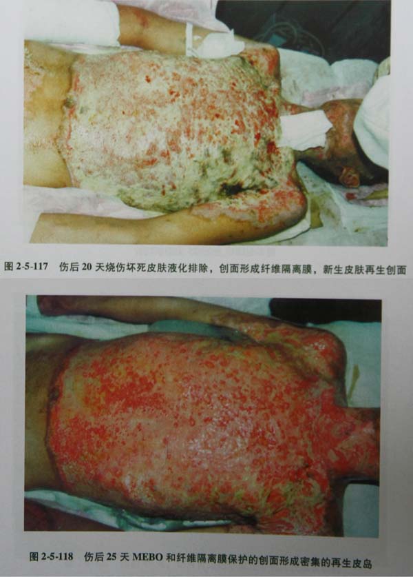4)Ⅲ度淺型創(chuàng)面涂藥后壞死組織液化的一般規(guī)律是:35天已去除腐皮的Ⅲ度淺型創(chuàng)面發(fā)白或白色。610天創(chuàng)面出現(xiàn)顆粒狀液化物,量多層厚,持續(xù)時(shí)間較長(zhǎng)。2535天液化物基本消失,創(chuàng)面新鮮。此時(shí)如Ⅲ度偏淺創(chuàng)面,可以繼續(xù)涂藥,觀察創(chuàng)面自行愈合情況。也可以同Ⅲ度偏深創(chuàng)面一起,行肉芽創(chuàng)面游離植皮,盡早消滅創(chuàng)面,以縮短病程和力爭(zhēng)減少瘢痕形成。