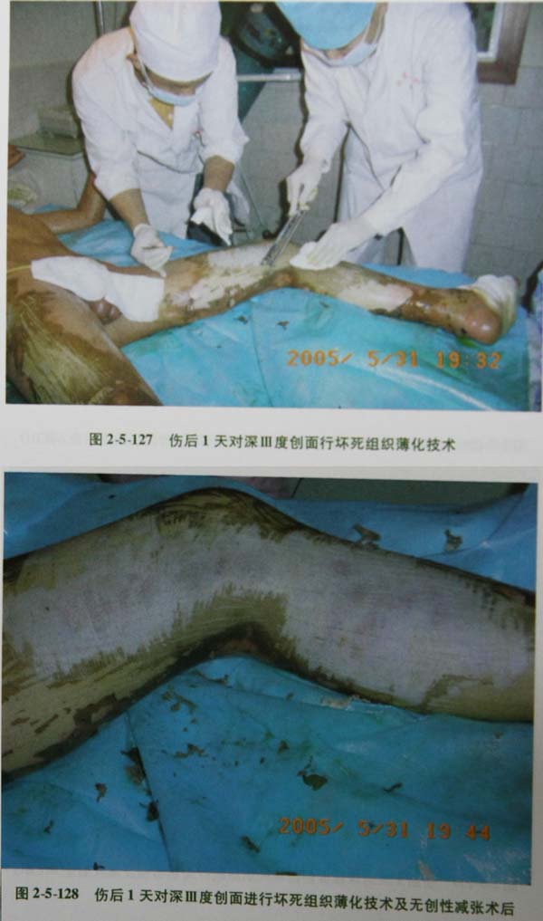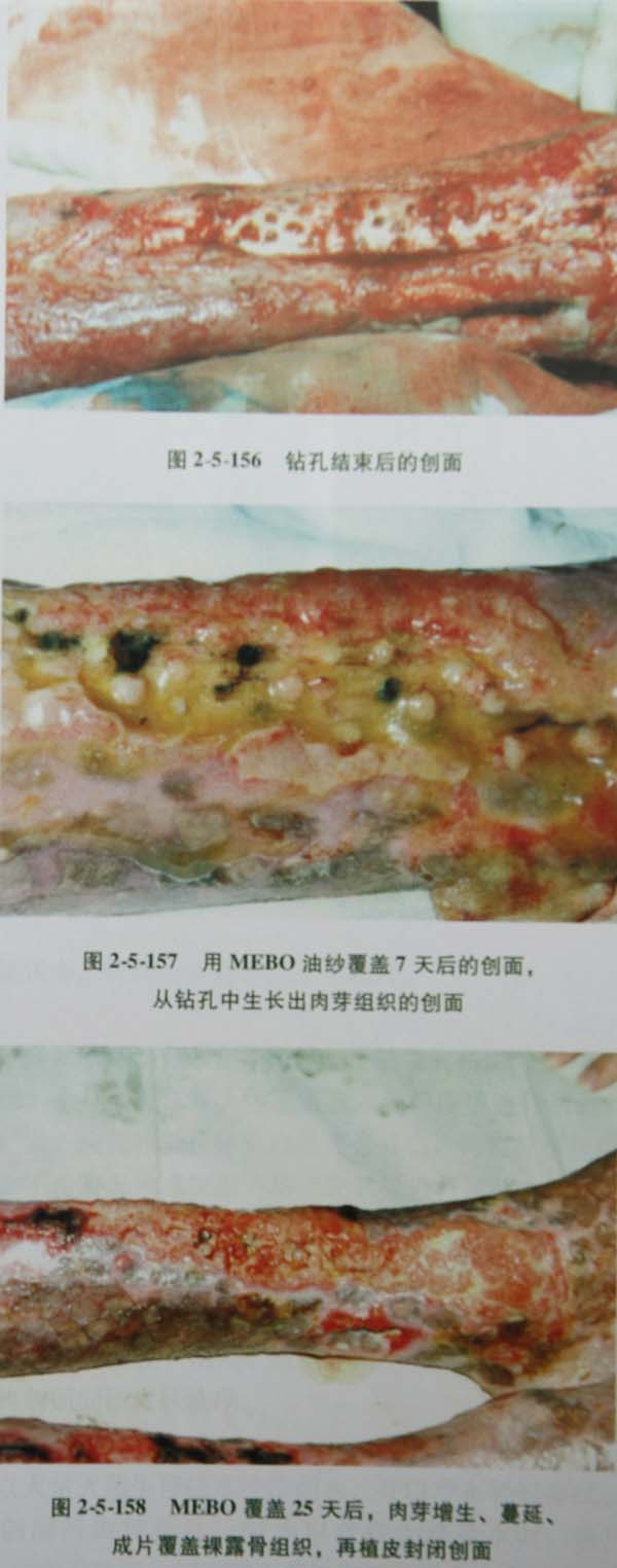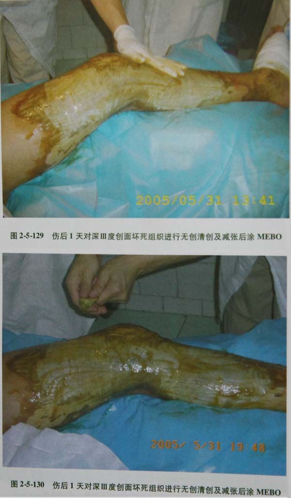 2在Ⅲ度深型創(chuàng)面的處置過(guò)程中,MEBT/MEBO仍不失為一種療法,早期創(chuàng)面可在MEBO保護(hù)下采用外科手術(shù)薄層切削壞死焦痂(壞死組織薄化技術(shù)),以減少燒傷毒素的吸收。但以創(chuàng)面保留部分壞死組織為度(即切除壞死組織的2/33/4),以盡量保留有活性的組織為原則,并始終以MEBO保護(hù)創(chuàng)面,促使創(chuàng)面殘存的壞死組織液化排除。