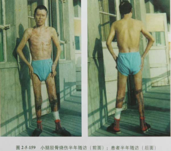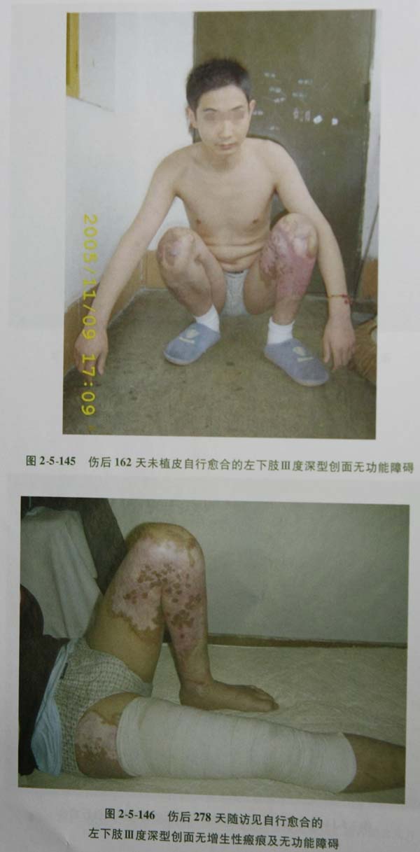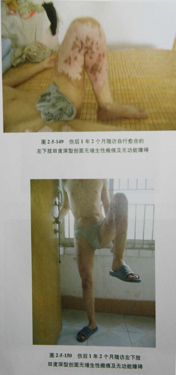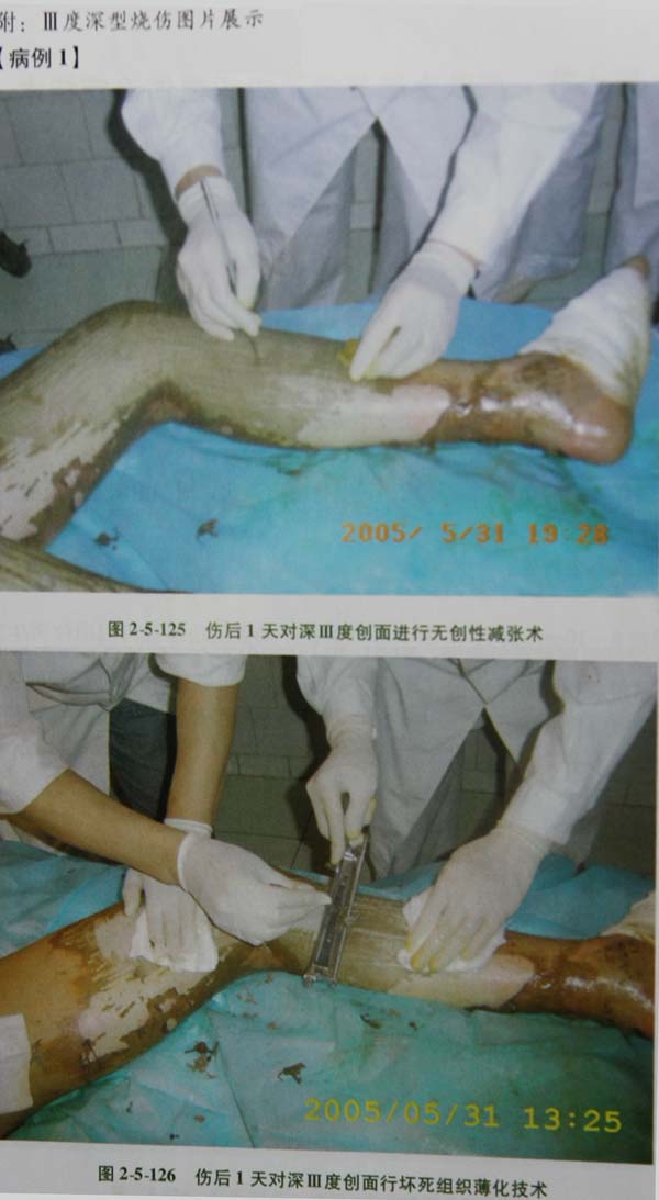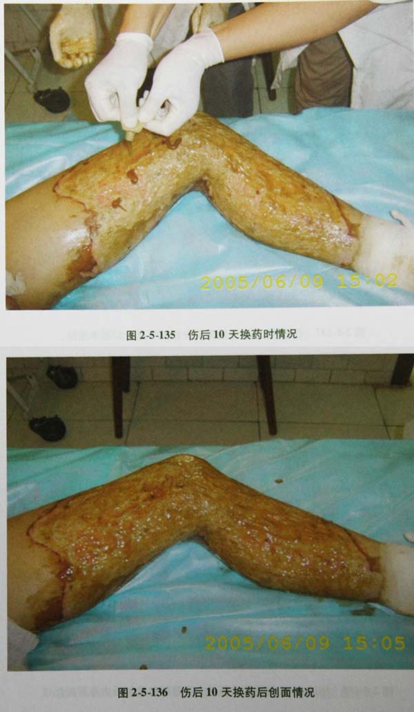 1)焦黃或炭化,焦痂質(zhì)硬干燥、涼,不治療或采用干法治療者,傷后12天透過(guò)焦痂可見(jiàn)栓塞的粗大血管網(wǎng)或切開(kāi)焦痂見(jiàn)肌肉紫暗無(wú)收縮性或關(guān)節(jié)、骨骼外露。
