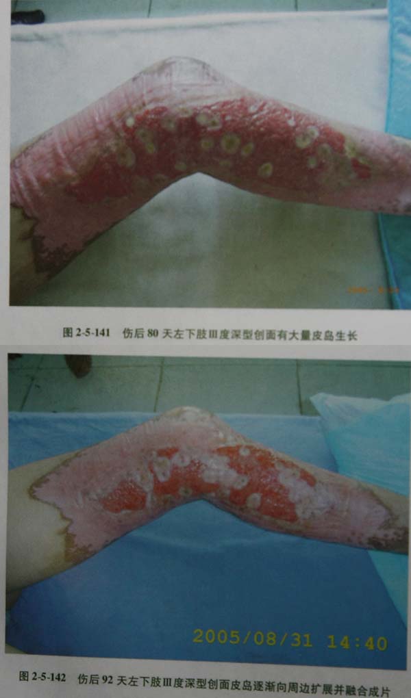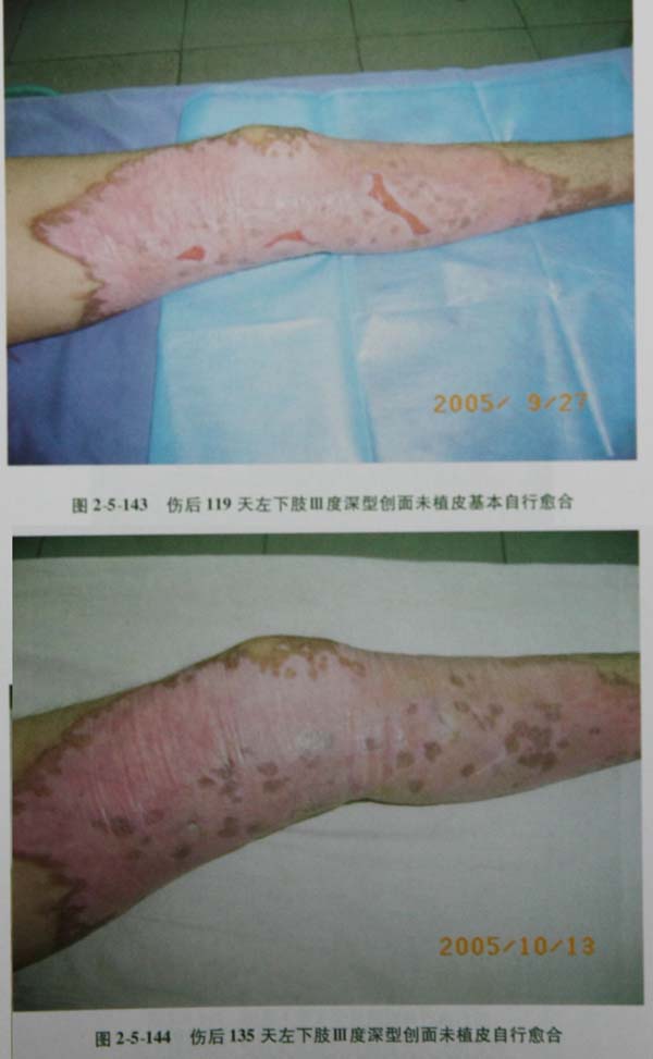 1創(chuàng)面直徑在610cm以內(nèi),應(yīng)用MEBO保護(hù)下的創(chuàng)面邊緣也可以原位再生復(fù)原擴(kuò)展封閉創(chuàng)面,如創(chuàng)面過(guò)大,傷員全身情況較差,也可以MEBO培養(yǎng)創(chuàng)面后再以局部植皮等綜合治療方式封閉創(chuàng)面。