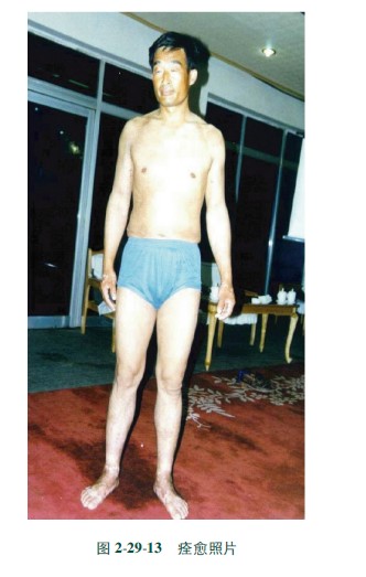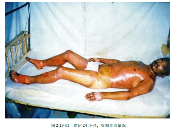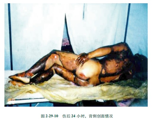2)大面積燙傷處理方法及原則與中小面積燙傷基本相同。所不同的是由于燒傷面積越大,毒性物質(zhì)的吸收量越多,故應(yīng)根據(jù)對(duì)病人的監(jiān)測(cè)情況而定。一旦發(fā)現(xiàn)病人血或尿中濃度超標(biāo),或有中毒先兆,應(yīng)果斷進(jìn)行外科手術(shù)治療,同時(shí)加強(qiáng)對(duì)毒性物質(zhì)的中和治療與對(duì)癥治療。如燒傷面積雖然很大,但全身情況較好,可取程采用MEBT/MEBO治療。圖2299~22914展示的照片是高溫堿性液體致傷病例。
