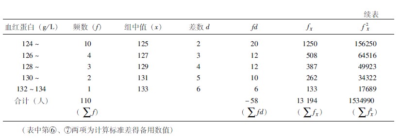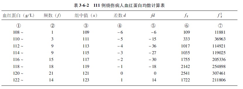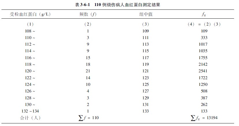 示例362某醫(yī)院測檢了110例特重度燒傷病人血液血紅蛋白含量,其濃度范圍在115~150g/L之間,頻數(shù)分布情況見表361,利用組中值方法計算他們的平均血紅蛋白濃度。
