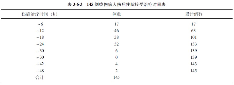 示例364表363中記錄了145例燒傷休克期病人傷后住院接受治療的時間(見表363),問他們休克期住院接受治療時間的中位數(shù)是多少?