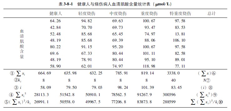 示例381健康人與輕度、中度、重度、特重度燒傷病人的血清肌酸(Cre)含量記錄于表381中,問(wèn)燒傷病人各期間的血清肌酸平均含量與健康人有無(wú)顯著差異?