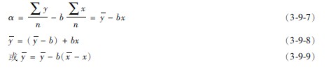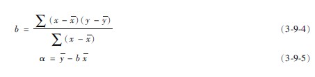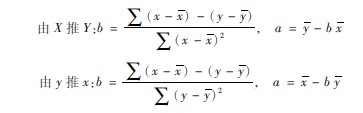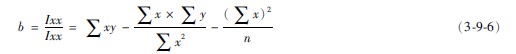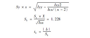 式中y為估計(jì)值;α為常數(shù),也稱為截距,即當(dāng)x等于零時在回歸直線軸上的交點(diǎn);b為回歸系數(shù),它是回歸直線的斜率,其意義是每當(dāng)x變動一個單位,則y隨之變動b個單位。