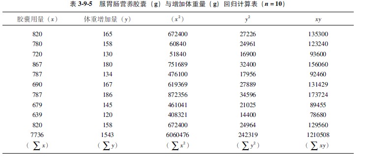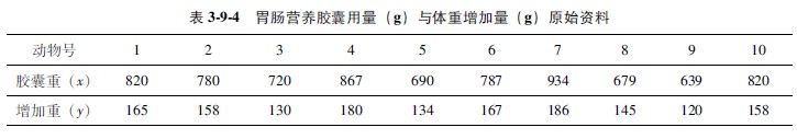 示例393某研究人員觀察胃腸營養(yǎng)膠囊的營養(yǎng)價(jià)值,用大白鼠做試驗(yàn),對每只大白鼠在觀察期間胃腸營養(yǎng)膠囊的用量(g)和體重增加量(g)匯入表(394)中,根據(jù)原始資料試作直線回歸分析。
