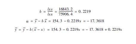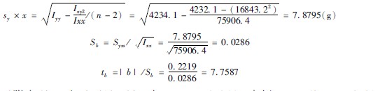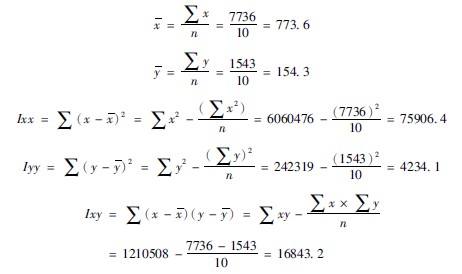 因?yàn)橐阎狪yy=42341,  Ixx=759064,  Ixy=168432,n=10, b=02219,將以上數(shù)據(jù)分別代入公式(3910)、(3911)、(3912),得: