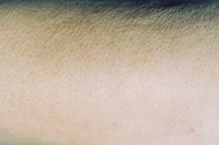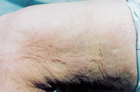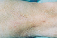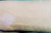 7. 深Ⅱ度、淺Ⅲ度混合度創(chuàng)面(右前臂及腕部屈側(cè))自行愈合后3年,皮膚結(jié)構(gòu)大部 分正常,部分色素缺失